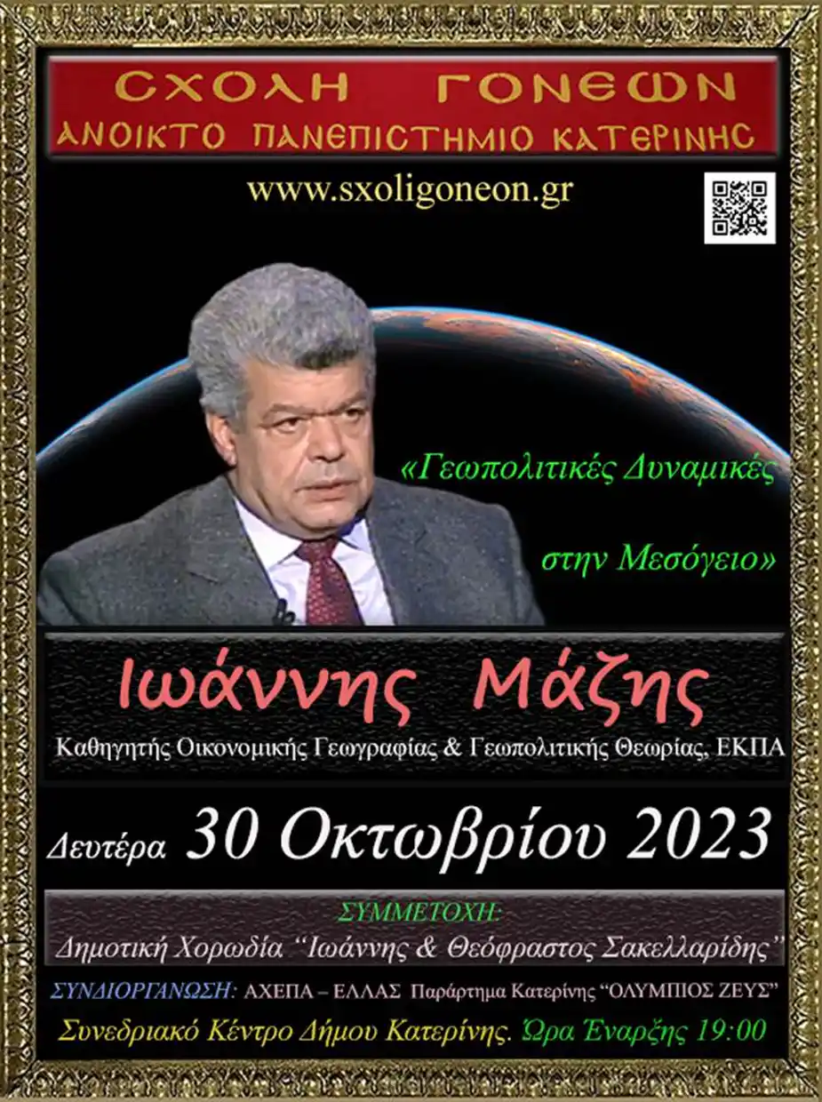 Επίκαιρη όσο ποτέ μετά τα δραματικά γεγονότα που εξελίσσονται στην μέση Ανατολή θα είναι η ομιλία του καθηγητή Οικονομικής Γεωγραφίας και Γεωπολιτικής Θεωρία του ΕΚΠΑ κ. Ιωάννη Μάζη με θέμα: «Γεωπολιτικές Δυναμικές στην Μεσόγειο» την Δευτέρα 30 Οκτωβρίου 2023 στις 19:00 στα πλαίσια των εκδηλώσεων της Σχολής Γονέων – Ανοικτό Πανεπιστήμιο Κατερίνης.