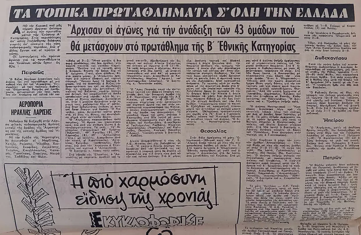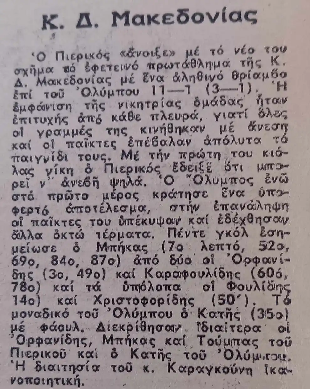 Το δημοσίευμα αναφέρει τα περί της συνάντησης Πιερικού-Ολύμπου στο πλαίσιο ενός γενικότερου ρεπορτάζ (Άρχισαν οι αγώνες για την ανάδειξη των 43 ομάδων που θα μετάσχουν στο πρωτάθλημα της β΄ Εθνικής Κατηγορίας) με το επίγραμμα επί του κειμένου, ότι «μετά τη νίκη ο Πιερικός έδειξε ότι μπορεί να ανεβεί ψηλά.» Όπερ και εγένετο.