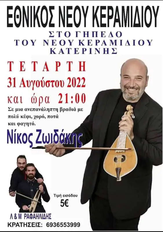 Ο Νίκος Ζωιδάκης έρχεται με τον αέρα της Κρήτης στο γήπεδο Ν. Κεραμιδίου Κατερίνης την Τετάρτη 31 Αυγούστου 2022. Ένα ξέφρενο κρητικό γλέντι υπό τους ήχους της λύρας του αγαπημένου κρητικού καλλιτέχνη και της ορχήστρας του μας περιμένει. Μαζί του οι Αφοί Ραφαηλίδη ενώνουν την Κρήτη με τον Πόντο σε μια ανεπανάληπτη βραδιά με πολύ, κέφι, χορό και φαγητό.