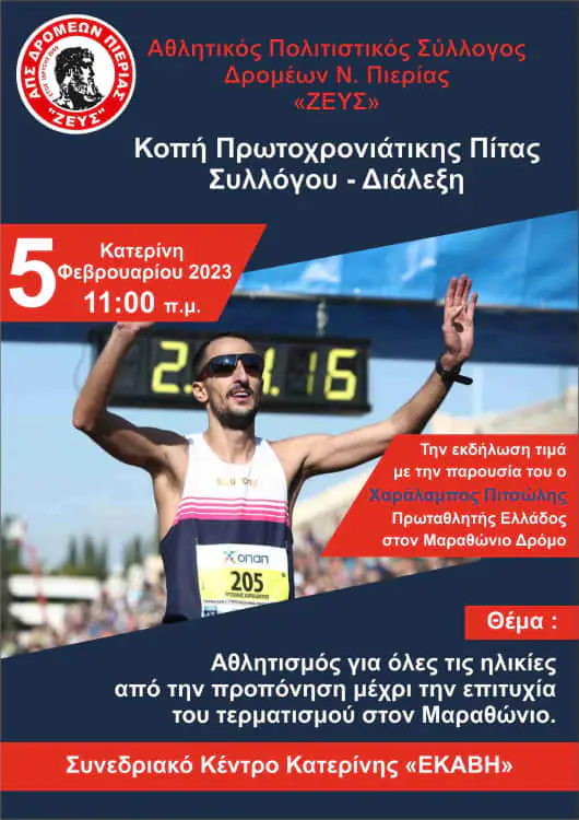 Σας προσκαλούμε στην κοπή της Πρωτοχρονιάτικης Πίτας του Αθλητικού Πολιτιστικού Συλλόγου Δρομέων Πιερίας “ΖΕΥΣ” που θα πραγματοποιηθεί την Κυριακή 5 Φεβρουαρίου 2023, στις 11:00 π.μ. στο Συνεδριακό Κέντρο “ΕΚΑΒΗ” στην Κατερίνη. Παράλληλα με την κοπή της Πρωτοχρονιάτικης Πίτας θα πραγματοποιηθεί διάλεξη από τον Πρωταθλητή Ελλάδος Χαράλαμπο Πιτσώλη με θέμα: “Αθλητισμός για όλες τις ηλικίες από την προπόνηση μέχρι την επιτυχία του τερματισμού στον Μαραθώνιο”.
