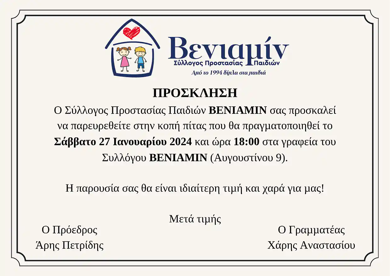 Ο Σύλλογος Προστασίας Παιδιών ΒΕΝΙΑΜΙΝ σας προσκαλεί στην κοπή πίτας που θα πραγματοποιηθεί το Σάββατο 27 Ιανουαρίου 2024 στις 18:00 στα γραφεία του συλλόγου επί της Αυγουστίνου 09