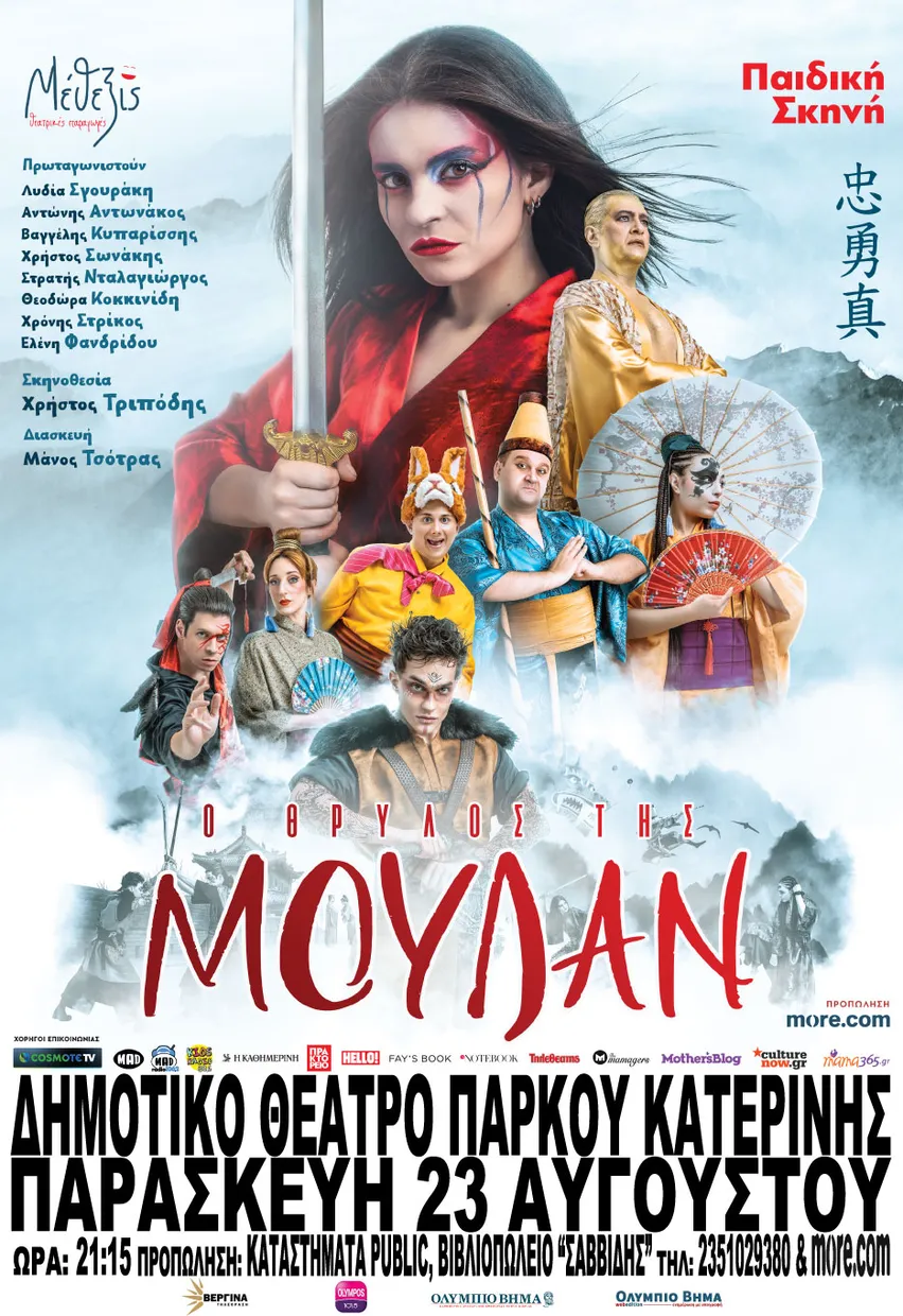 «Ο Θρύλος της Μουλάν», ένας από τους διασημότερους μύθους παγκοσμίως παρουσιάζεται την Παρασκευή 23 Αυγούστου στην Κατερίνη από την παιδική σκηνή του Χρήστου Τριπόδη και την εταιρία Μέθεξις. Πρόκειται για μία φαντασμαγορική θεατρική παραγωγή, βασισμένη στο αρχαίο κινέζικο ποίημα «Η Μπαλάντα της Χουά Μουλάν», με εντυπωσιακά κοστούμια, σκηνικά, σπαθομαχίες και χορογραφίες, καθώς και διαδραστικό παιχνίδι με το κοινό.