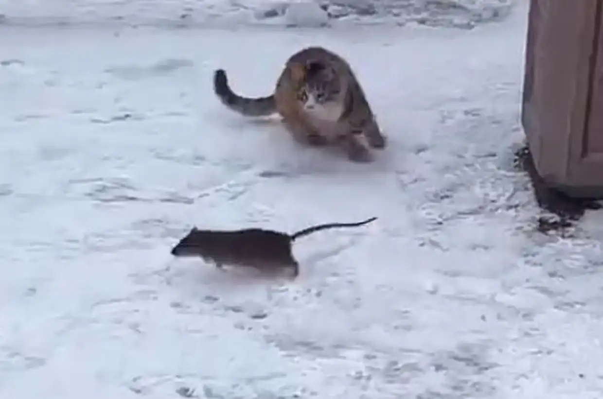 Μια γάτα κυνηγά ένα ποντίκι, το οποίο μέσα σε λίγα δευτερόλεπτα αποκτά εκείνο το ρόλο του κυνηγού.