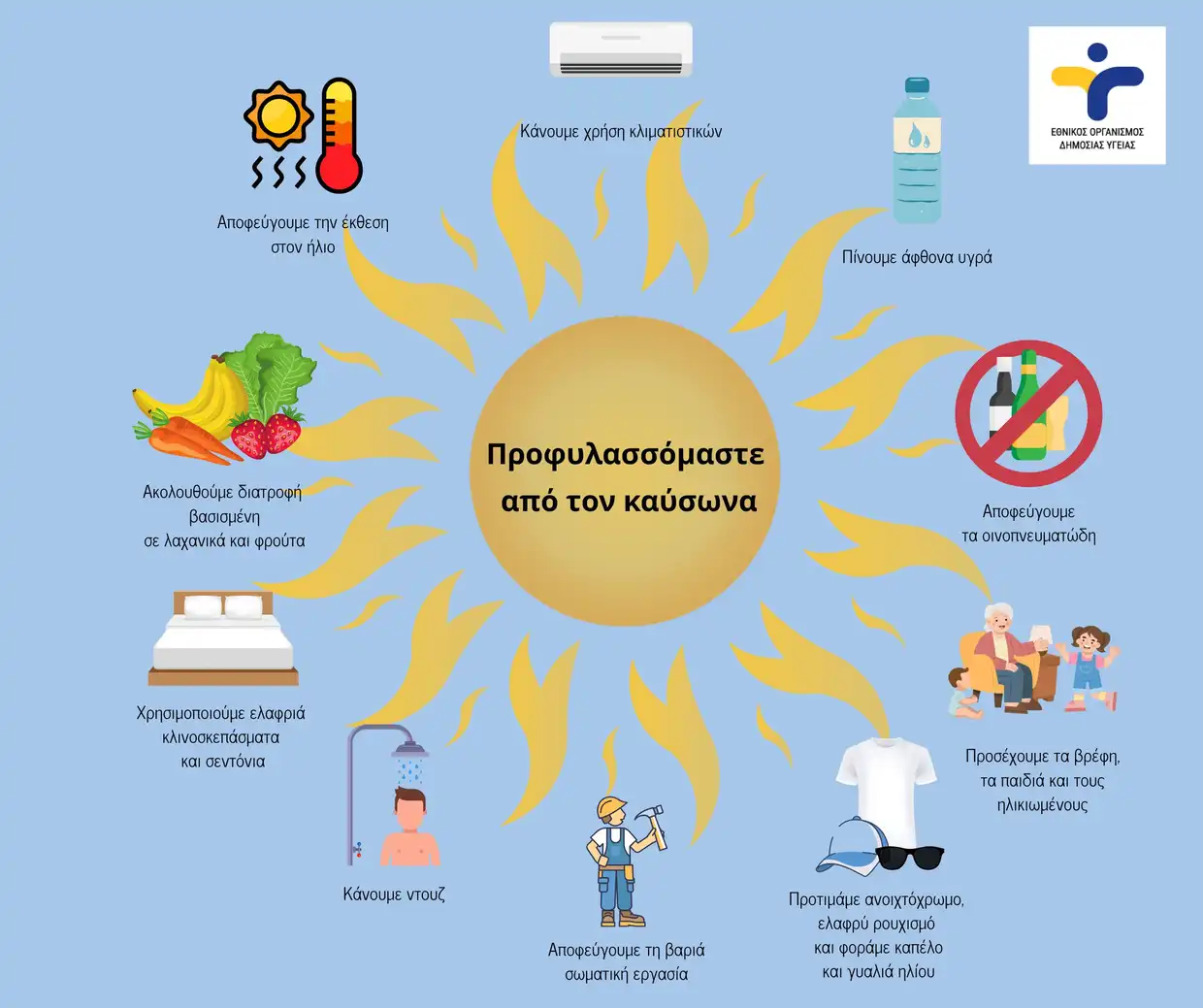 - να μάθουμε τα συμπτώματα της θερμικής εξάντλησης και της θερμοπληξίας καθώς και τους τρόπους να τα αντιμετωπίζουμε: https://eody.gov.gr/kaysonas/mathete-ta-symptomata-tis-thermikis-exantlisis-kai-tis-thermoplixias/