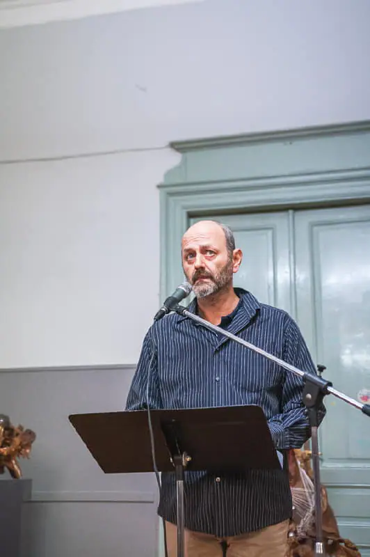 Ακολούθησε χαιρετιστήρια ομιλία του προέδρου του Συλλόγου κ. Παναγιώτη Φτάρα όπου τόσο με τον χαιρετισμό του όσο και με την εισήγησή του τόνισε την αξία της Τέχνης για την ανθρώπινη ψυχή λέγοντας “ Χωρίς τέχνη, η σκληρότητα της πραγματικότητας θα καθιστούσε τον κόσμο αφόρητο. Η Τέχνη είναι υπεύθυνη, να προκαλεί την ψυχική δραστηριότητα που είναι σημαντική, για τα ανθρώπινα συναισθήματα. Η Τέχνη που σαν εικόνισμα στον τοίχο, μας δίνει φως, ελπίδα, χαρά, μνήμες. Η Τέχνη που το μόνο μέλημά της είναι να μας μεταδώσει το δέος. Η Τέχνη που μεταφέρει ιδανικά και αξίες. Τιμάμε σήμερα τους Δασκάλους μας, κ. Γιάννη Γκόγκο, κ. Αθανάσιο Καραμήτα και Αθανάσιο Σταθακόπουλο, χωρίς αυτούς σήμερα δεν θα βρισκόμασταν όλοι εδώ».