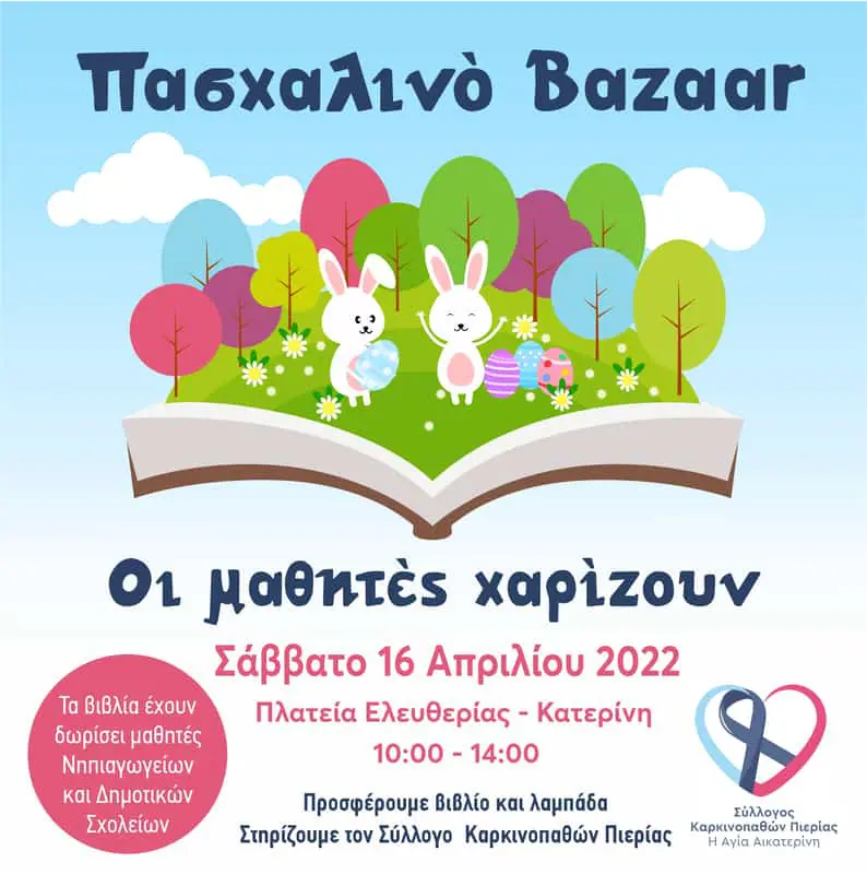 Ο Σύλλογος Καρκινοπαθών Πιερίας ευχαριστεί και συγχαίρει τους μαθητές και τις μαθήτριες των Δημοτικών Σχολείων, Νηπιαγωγείων, Φροντιστηρίων Ξένων Γλωσσών & τη θεραπευτική Ομάδα ΜΟΘΕ ΟΚΑΝΑ που συμμετέχουν με δωρεά βιβλίων τους στο Πασχαλινό Bazaar υποστήριξης για τους ασθενείς με καρκίνο