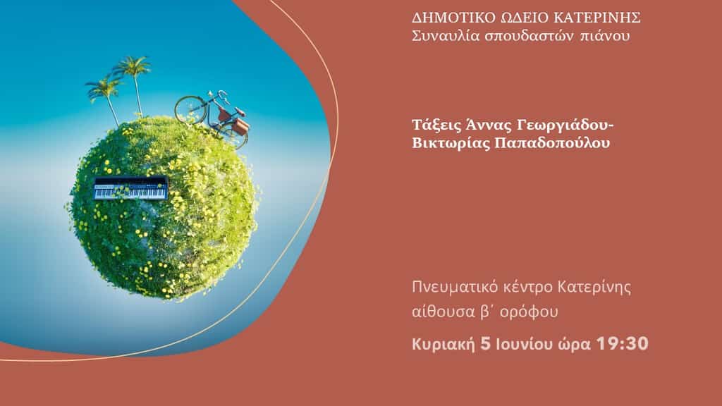 Την Τετάρτη 8 Ιουνίου, ώρα 19:30 θα πραγματοποιηθεί ρεσιτάλ πιάνου του τελειόφοιτου σπουδαστή Θωμά-Παρασκευά Λυμπανοβνού, της τάξης της Παλίνας Ζαβράζνοβα. Το πρόγραμμα περιλαμβάνει έργα των J.S. Bach,, D. Scarlatti, L.V. Beethoven, F. Chopin, M. Moszkowski, S. Rachmaninoff και Μ. Χατζιδάκι.Οι μουσικές εκδηλώσεις του Δημοτικού Ωδείου Κατερίνης