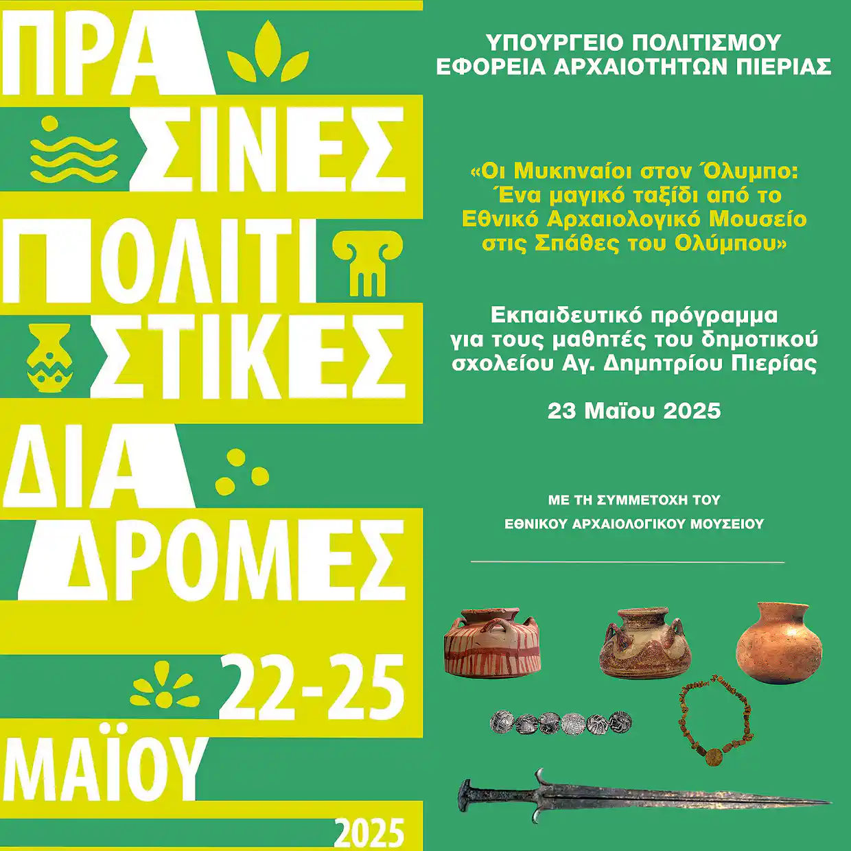 Το εκπαιδευτικό πρόγραμμα με τίτλο: «Οι Μυκηναίοι στον Όλυμπο: Ένα μαγικό ταξίδι από το Εθνικό Αρχαιολογικό Μουσείο στις Σπάθες του Ολύμπου» θα παρουσιαστεί στο Δημοτικό Σχολείο Αγίου Δημητρίου Πιερίας την Παρασκευή 23 Μαΐου το πρωί, στο πλαίσιο των Πράσινων Πολιτιστικών Διαδρομών του Υπουργείου Πολιτισμού. Το πρόγραμμα απευθύνεται στους μαθητές του Δημοτικού Σχολείου Αγίου Δημητρίου, όπου βρίσκεται ο αρχαιολογικός χώρος Σπάθες (Μυκηναϊκό Νεκροταφείο της Ύστερης Εποχής του Χαλκού).