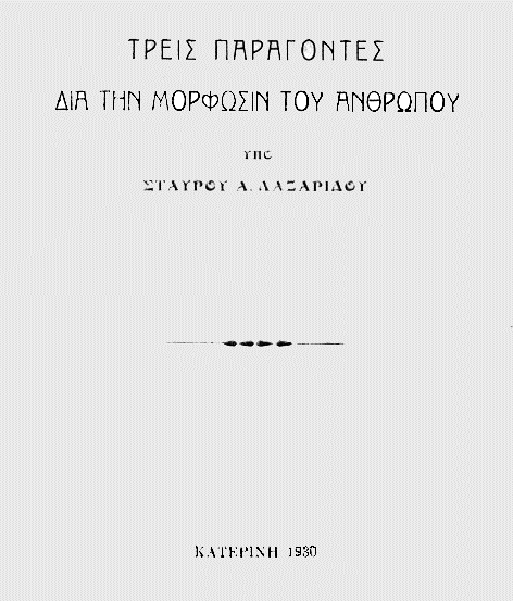 - ΛΑΖΑΡΙΔΗΣ, ΣΤΑΥΡΟΣ. Τρεις παράγοντες δια την μόρφωσιν του ανθρώπου, Κατερίνη: [Τύποις ‘Ηχώ των Πιερίων’], 1930.