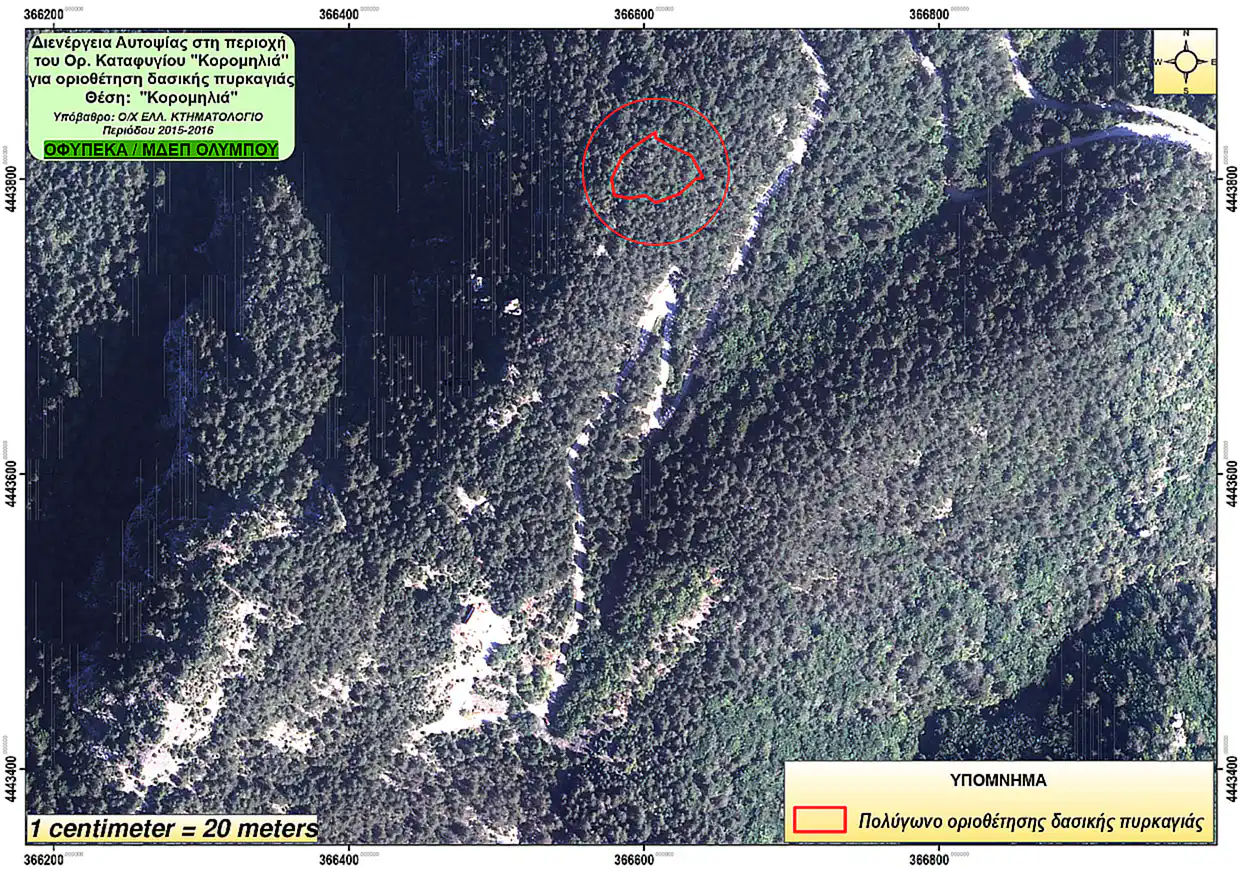 Κάηκε δασικός υπόροφος δύο στρεμμάτων σε απόσταση 400μ. περίπου από το καταφύγιο Κορομηλιάς όπως φαίνεται στους χάρτες και το φωτογραφικό υλικό.
