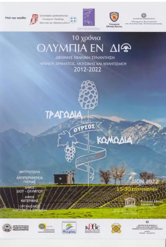 Την Πέμπτη 29 Σεπτεμβρίου 2022 πέφτει θεατρικά η αυλαία της δέκατης διοργάνωσης της Διεθνούς Νεανικής Συνάντησης Αρχαίου Δράματος, Μουσικής και Αθλητισμού που υλοποιεί ο θεσμός των «ΟΛΥΜΠΙΩΝ ΕΝ ΔΙΩ». Συνολικά δώδεκα θεατρικά σύνολα από σχολεία της χώρας μας και δύο του εξωτερικού, εκφράστηκαν καλλιτεχνικά το δεύτερο δεκαπενθήμερο του τρέχοντος Σεπτεμβρίου στο αρχαίο θέατρο του Δίου, στην ιερή πόλη των Μακεδόνων.