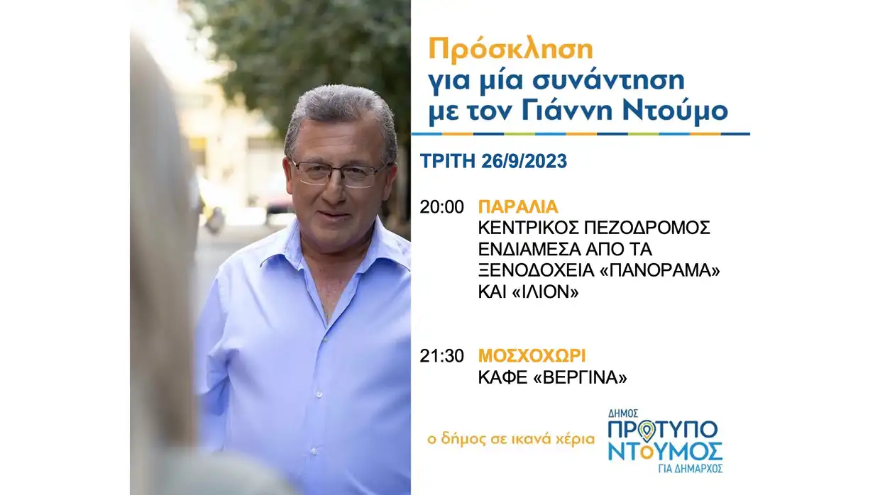 Ο Υποψήφιος Δήμαρχος Κατερίνης, Γιάννης Ντούμος, επικεφαλής του Συνδυασμού “ΔΗΜΟΣ ΠΡΟΤΥΠΟ”, μιλάει σήμερα, Τρίτη 26 Σεπτεμβρίου 2023, σε δύο ανοιχτές συγκεντρώσεις.