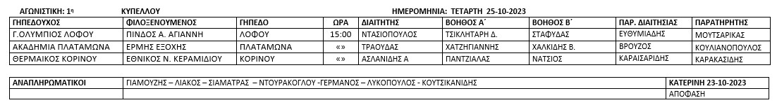 Ορισμός διαιτητών και βοηθών διαιτητού για τους αγώνες Κυπέλλου της Ε.Π.Σ. Πιερίας στις 25-10-2023.