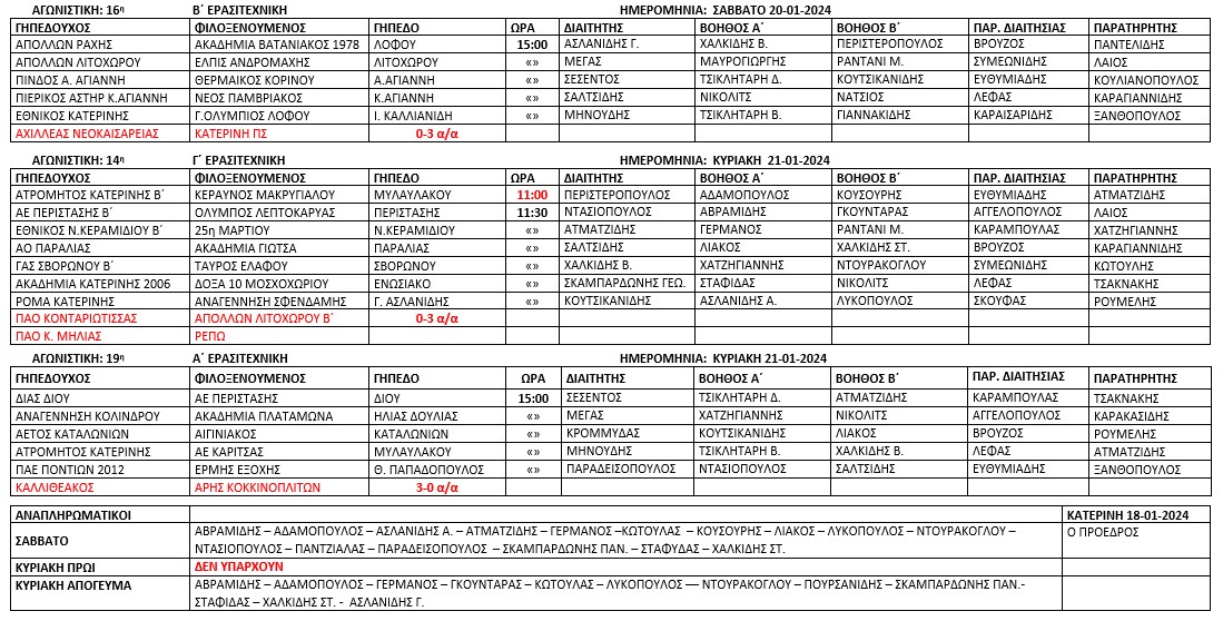 Στην Νέα Έφεσο και στα γραφεία της Ε.Π.Σ. Πιερίας σήμερα 18-01-2024 ημέρα Πέμπτη και ώρα 15:00 συνήλθε σε συνεδρίαση η Επιτροπή Διαιτησίας της Ε.Π.Σ. Πιερίας που αποτελείται από τους Ευθυμιάδη Δαμιανό Πρόεδρο, Καραισαριδη Νικόλαο Αναπληρωτή Πρόεδρο και τα μέλη , Συμεωνίδη Παναγιώτη και Λέφα Γρηγόριο, με θέμα τον ορισμό διαιτητών και βοηθών διαιτητού για τους αγώνες πρωταθλήματος της Ε.Π.Σ. Πιερίας που θα πραγματοποιηθούν την 20 & 21-01-2024.