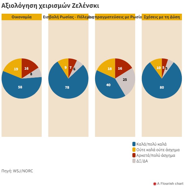 Η εμπιστοσύνη στον Ζελένσκι παραμένει σε υψηλά επίπεδα. Παρότι οι εξελίξεις στο μέτωπο δεν είναι ευνοϊκές για την Ουκρανία τον τελευταίο μήνα, το 87% των Ουκρανών συνεχίζουν να τον εμπιστεύονται, λιγότερο ή περισσότερο, για τον χειρισμό των πολεμικών επιχειρήσεων.