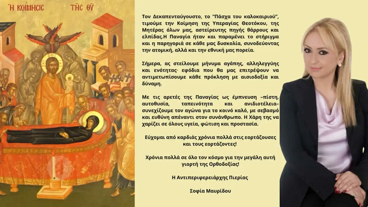 Τον Δεκαπενταύγουστο, το “Πάσχα του καλοκαιριού”, τιμούμε την Κοίμηση της Υπεραγίας Θεοτόκου, της Μητέρας όλων μας, αστείρευτης πηγής θάρρους και ελπίδας. Η Παναγία ήταν και παραμένει το στήριγμα και η παρηγοριά σε κάθε μας δυσκολία, συνοδεύοντας την ατομική, αλλά και την εθνική μας πορεία.