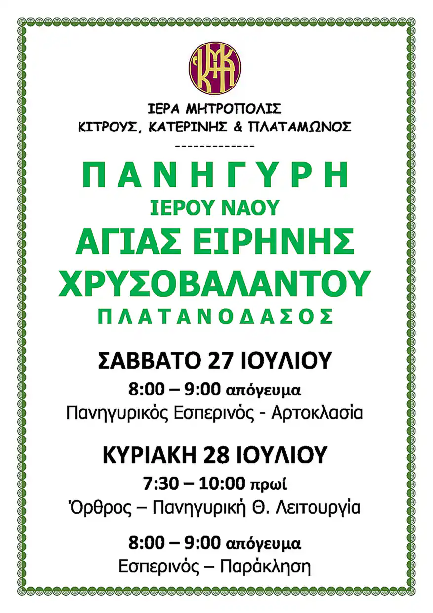 Πανήγυρη Ιερού Ναού Αγίας Ειρήνης Χρυσοβαλάντου στο Πλατανόδασος Νεοκαισάρειας