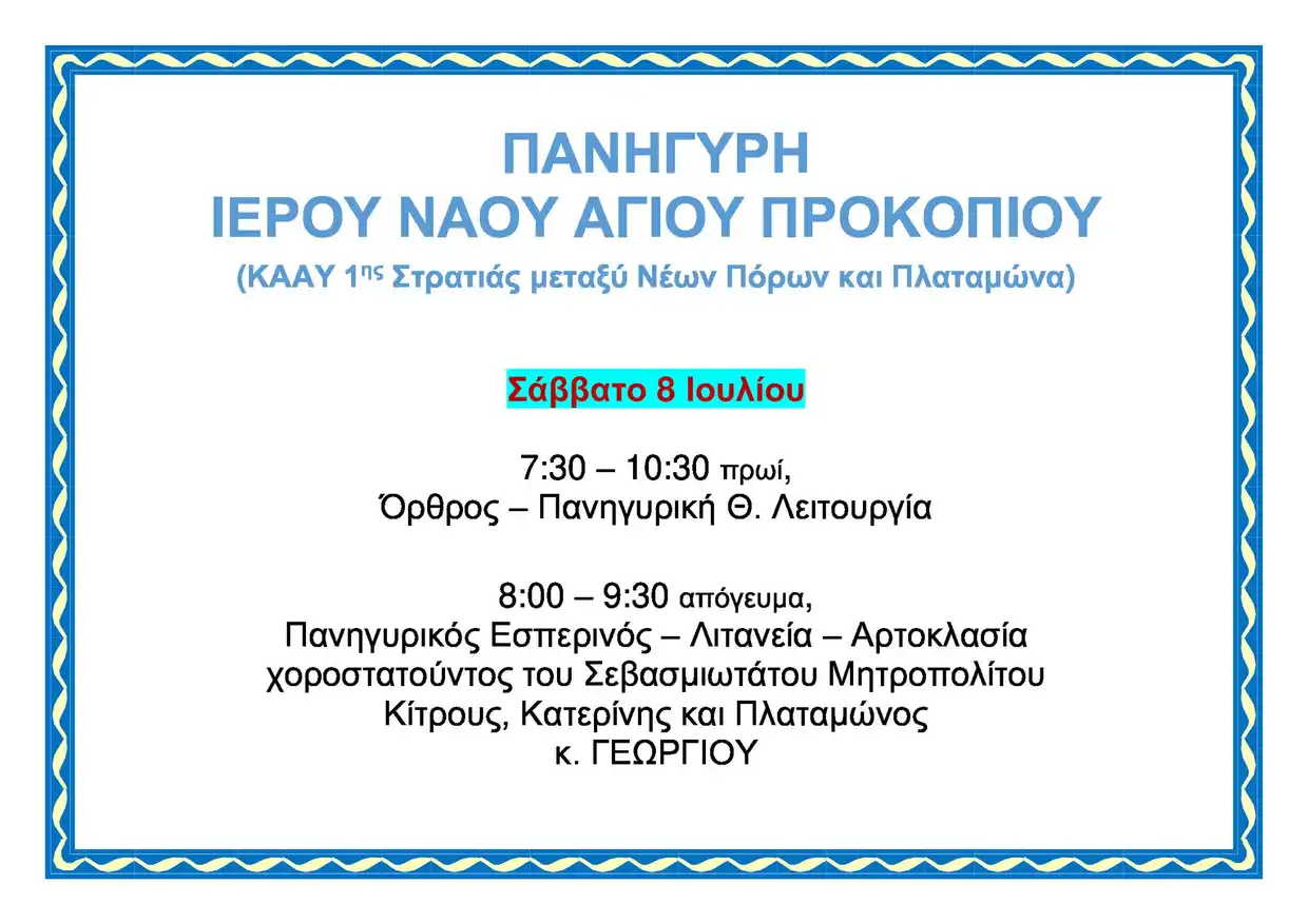 Πανήγυρη Ιερού Ναού Αγίου Προκοπίου