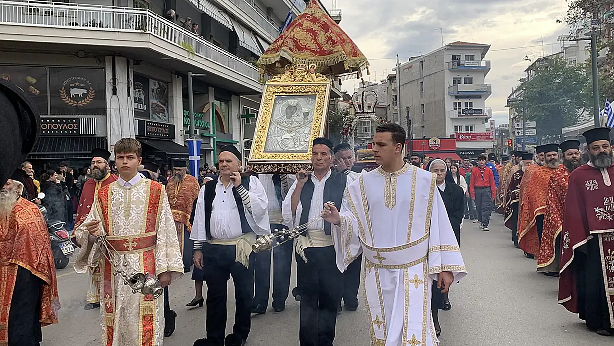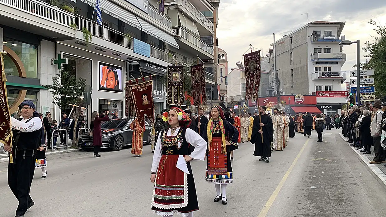 Η λιτανεία κινήθηκε στους κεντρικούς δρόμους της πόλης, συνοδευόμενη από αρχιερείς, βουλευτές Πιερίας και φορείς τοπικής αυτοδιοίκησης, πολιτιστικούς συλλόγους, φιλαρμονική, με πλήθος κόσμου από όλη την πόλη να παρακολουθεί την εντυπωσιακή λιτάνευση.