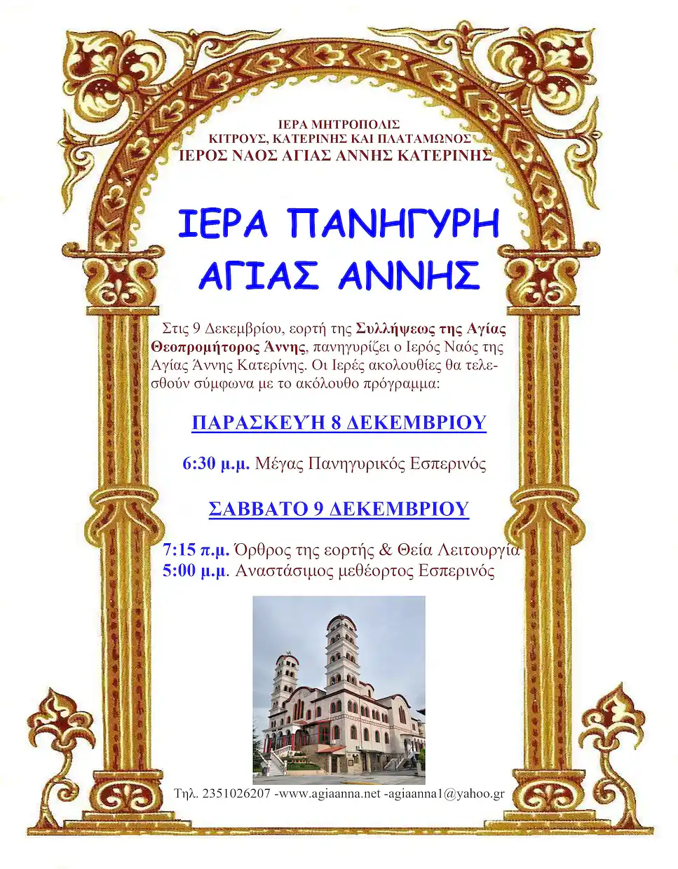Πανηγυρίζει ο Ιερός Ναός Αγίας Άννης Κατερίνης