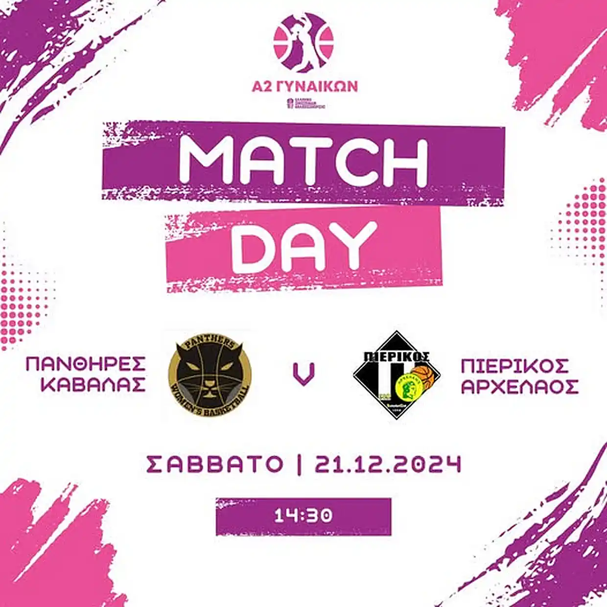 Τους Πάνθηρες Καβάλας (8-1) αντιμετωπίζει ο Πιερικός Αρχέλαος (5-4) στο Δημοτικό Αθλητικό Κέντρο Καλαμίτσας Αλεξάνδρα Δήμογλου, το Σάββατο 21 Δεκεμβρίου στις 14:30, στο πλαίσιο της 11ης αγωνιστικής του 2ου ομίλου της Α2 Εθνικής Κατηγορίας Γυναικών.