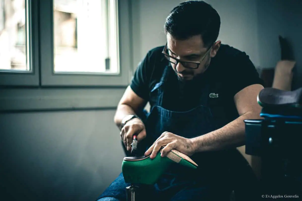 »Περνώντας τα χρόνια και ξεκινώντας η κρίση το 2008, τα πράγματα έγιναν δύσκολα και τότε ένιωσα την ανάγκη για μια αλλαγή. Έψαχνα να στραφώ και σε ένα άλλο επάγγελμα που να είναι παράλληλα και δημιουργικό. Σαφώς υπήρχε πάντα το δίλλημα αν θα άφηνα το θέατρο και τη σκηνοθεσία. Και τελικά η αφορμή για την απόφαση να γίνω υποδηματοποιός ήρθε μέσα από το θέατρο και πιο συγκεκριμένα από το μάθημα ενδυματολογίας – σκηνογραφίας. Μας είχε ζητηθεί τότε να ετοιμάσουμε τα κουστούμια για μια παράσταση, για ένα αρχαίο δράμα, κι εγώ είχα ζητήσει να φτιάξω τα παπούτσια. Θυμάμαι να περπατάω στο δρόμο, όταν είδα ένα παλιό λάστιχο από ένα φορτηγό κι από αυτό έφτιαξα όλα τα σανδάλια. Έπειτα βρήκα μια σχολή στην Αθήνα, όπου πήγα επιφυλακτικά και τελικά έμεινα δυόμιση χρόνια. Τελειώνοντας τη σχολή, πήγα στο Μιλάνο όπου και παρακολούθησα σεμινάρια υποδηματοποιίας κι επεξεργασίας του δέρματος (κοπή, βαφή, φινίρισμα). Έκτοτε ασχολούμαι με το custom made παπούτσι».