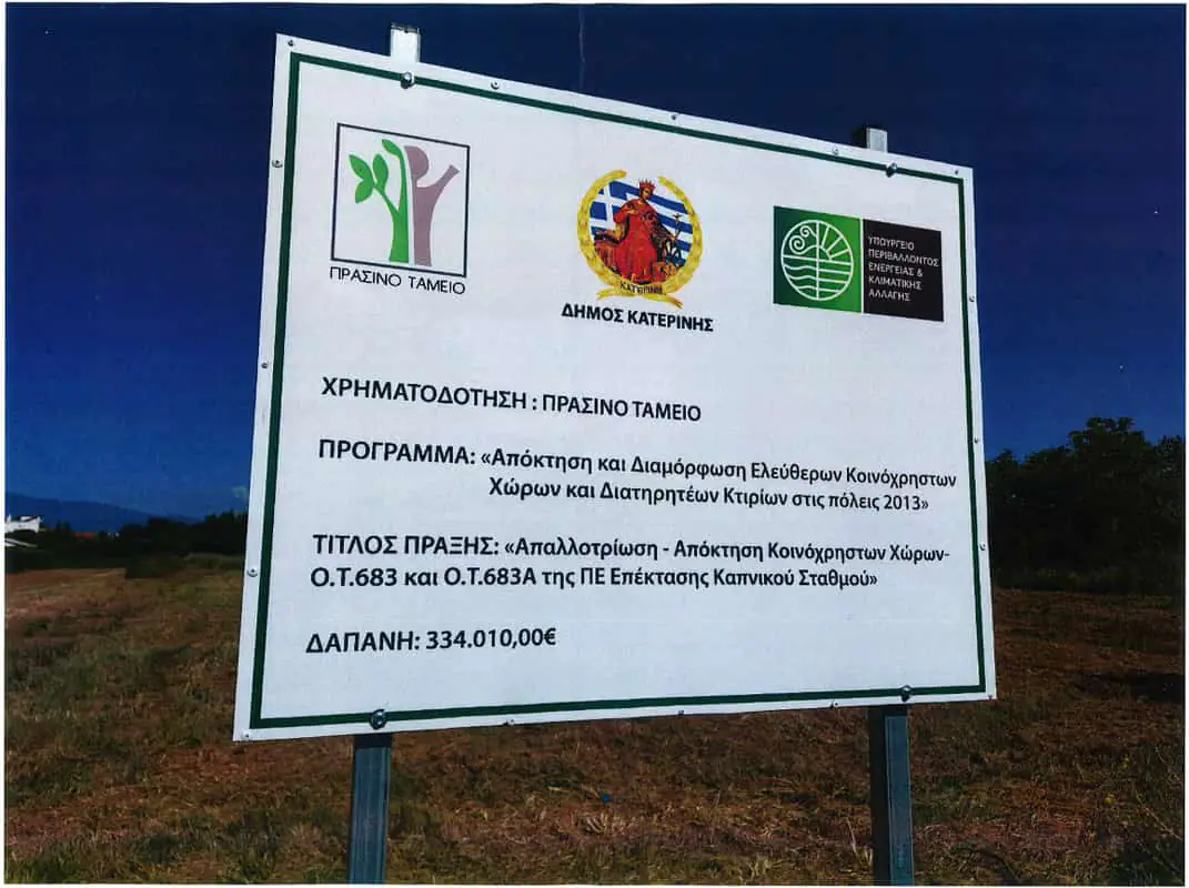 Ο Δήμος Κατερίνης φρόντισε εγκαίρως να προετοιμάσει και να υποβάλει την σχετική πρόταση η οποία εγκρίθηκε από το Δ.Σ. του Πράσινου Ταμείου, στο πλαίσιο του Χρηματοδοτικού Προγράμματος «Απόκτηση και διαμόρφωση ελεύθερων Κοινόχρηστων Χώρων και διατηρητέων κτιρίων στις πόλεις 2013».
