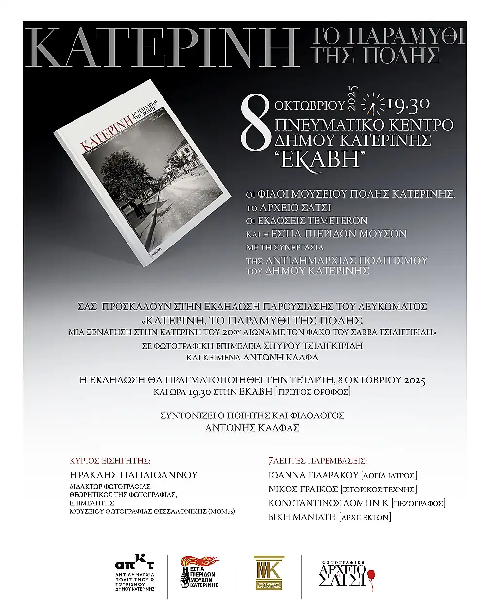 Οι Φίλοι Μουσείου Πόλης Κατερίνης, το Αρχείο ΣάΤσι και η Εστία Πιερίδων Μουσών προσκαλούν στην παρουσίαση του λευκώματος του Σπύρου Τσιλιγκιρίδη και Αντώνη Κάλφα. Τετάρτη 8 Οκτωβρίου, 19:30, ΕΚΑΒΗ. Είσοδος ελεύθερη.