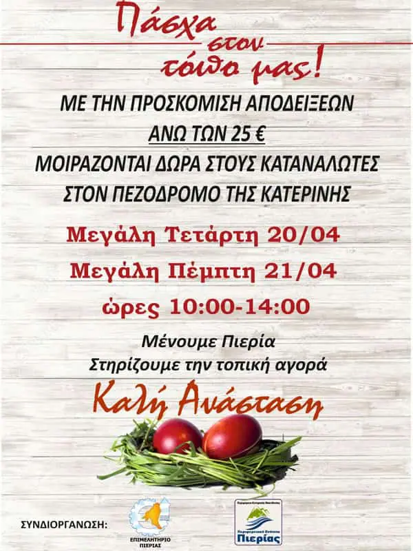 Τη Μ. Τετάρτη 20 Απριλίου και τη Μ. Πέμπτη 21 Απριλίου, το Επιμελητήριο Πιερίας, σε συνεργασία με την Π.Ε. Πιερίας, από τις 10:00 π.μ. έως τις 2:00 μ.μ., σε ειδικό περίπτερο στο κέντρο του πεζοδρόμου της Κατερίνης, θα διανείμει Πασχαλινά δώρα σε καταναλωτές, που θα προτιμήσουν για τις αγορές τους τα τοπικά καταστήματα και θα προσκομίζουν, αυθημερόν, αποδείξεις άνω των 25 ευρώ.