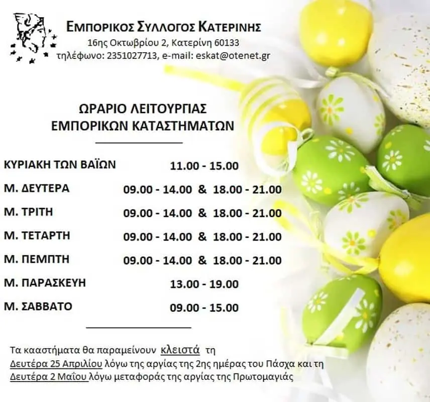 Ξεκινά σήμερα, Κυριακή των Βαΐων, στην Κατερίνη το εορταστικό ωράριο των εμπορικών καταστημάτων στην πόλη μας, όπως ανακοίνωσε ο Εμπορικός Σύλλογος Κατερίνης.