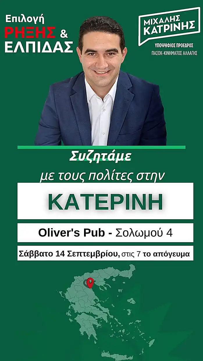 Με το μήνυμα «Συζητάμε με τους πολίτες» ο Μιχάλης Κατρίνης διοργανώνει ανοιχτή συγκέντρωση και συζήτηση με τους πολίτες στις 19:00 το βράδυ, στο καφέ «Oliver’s Pub», Σολωμού 4, Κατερίνη.