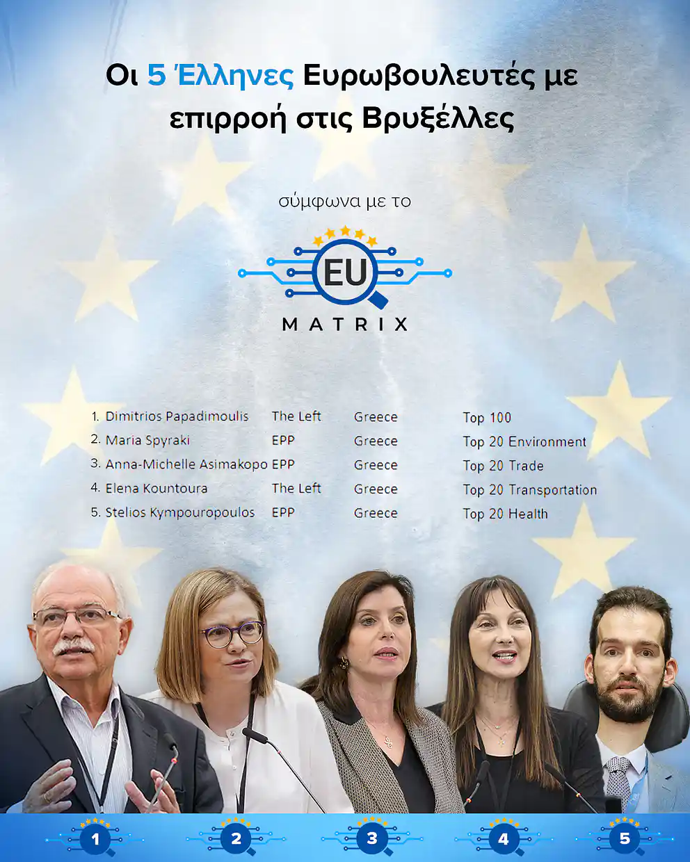 Πέντε από τους 21 Έλληνες ευρωβουλευτές συμπεριλαμβάνονται στον κατάλογο με τους ευρωβουλευτές που ασκούν τη μεγαλύτερη επιρροή στην Ευρωπαϊκή Ένωση, στο σύνολο των 705, με βάση τη μέτρηση επίδοσης που διενεργεί ο ιστότοπος EUMatrix για το Influence Index 2024.