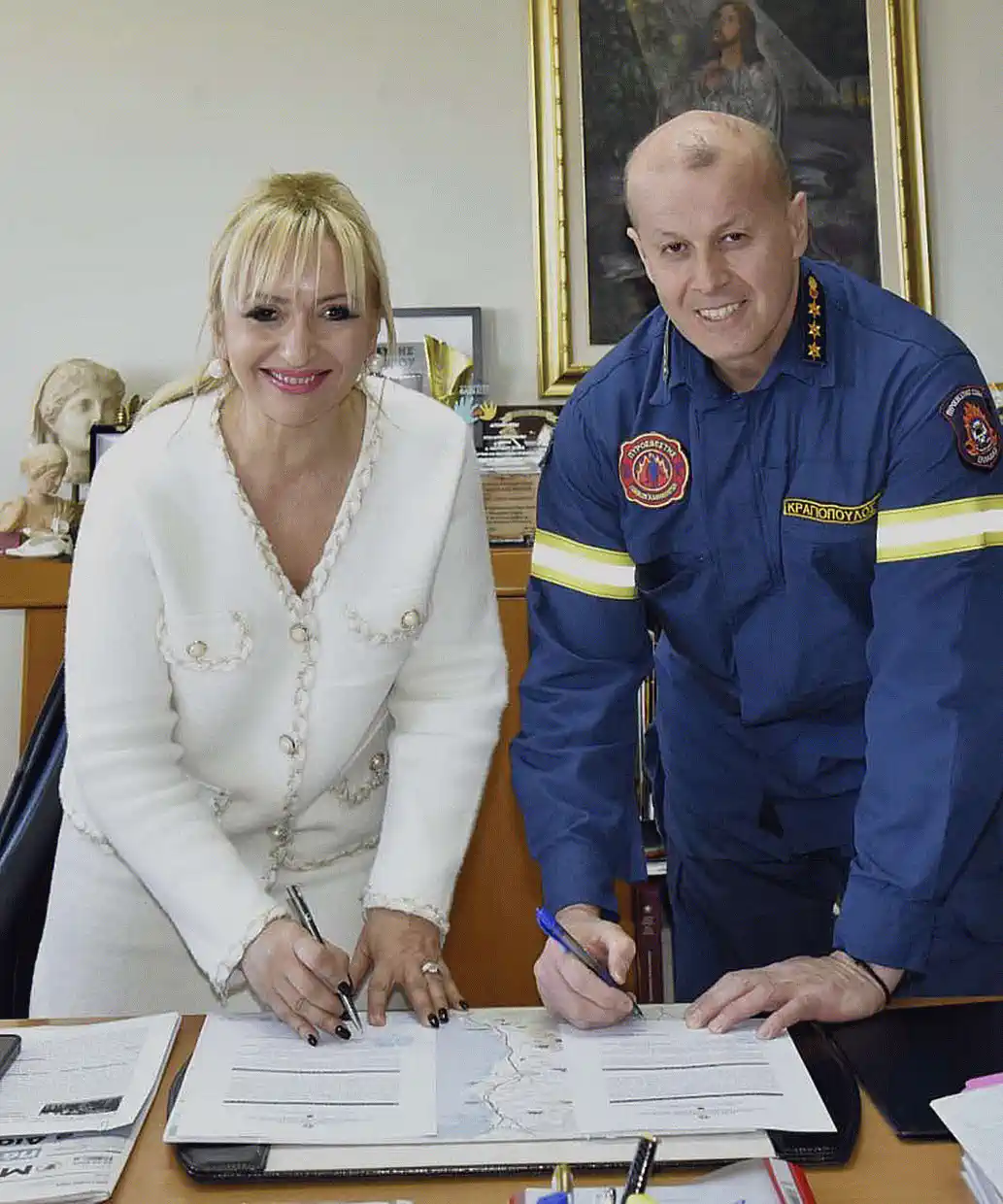 Στο πλαίσιο των ρόλων, αρμοδιοτήτων και κύριων δράσεων των Περιφερειών για την αντιμετώπιση κινδύνων από την εκδήλωση χιονοπτώσεων και παγετού, όπως αυτά προκύπτουν από το Γενικό Σχέδιο Αντιμετώπισης Εκτάκτων Αναγκών και Άμεσης/Βραχείας Διαχείρισης των Συνεπειών από την Εκδήλωση Χιονοπτώσεων και Παγετού με την κωδική ονομασία «ΒΟΡΕΑΣ 2» της Περιφέρειας Κεντρικής Μακεδονίας, η Αντιπεριφερειάρχης Πιερίας, Σοφία Μαυρίδου παραδίδει στον Διοικητή Πυροσβεστικών Υπηρεσιών Νομού Πιερίας, πύραρχο Δημήτριο Κραγιόπουλο, ισοθερμικές κουβέρτες αλουμινίου καθώς και πρόχειρα γεύματα για την διανομή τους σε οδηγούς και επιβάτες σε περιπτώσεις ακινητοποίησης οχημάτων στο οδικό δίκτυο αρμοδιότητας της Περιφερειακής Ενότητας Πιερίας λόγω χιονοπτώσεων ή παγετού.
