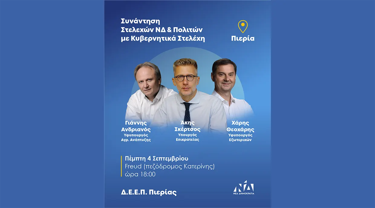 Την Πέμπτη 4 Σεπτεμβρίου 2025, κυβερνητικό κλιμάκιο θα επισκεφθεί την Πιερία για σειρά επαφών και συναντήσεων, στο πλαίσιο της ενίσχυσης της τοπικής ανάπτυξης και της συνεργασίας με φορείς και πολίτες.