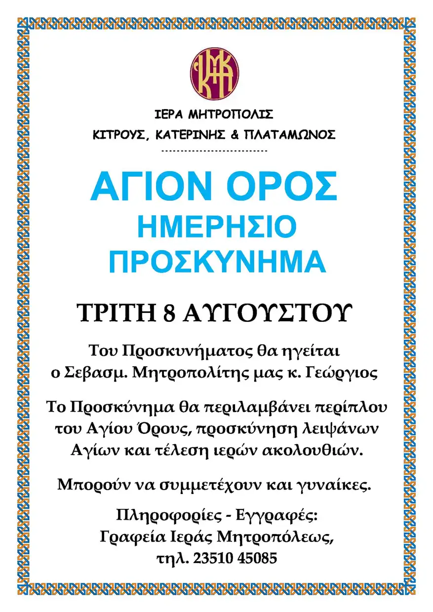 Περίπλου του  Αγίου Όρους διοργανώνει η Ιερά Μητρόπολη Κίτρους, Κατερίνης και Πλαταμώνος την Τρίτη 8 Αυγούστου 2023