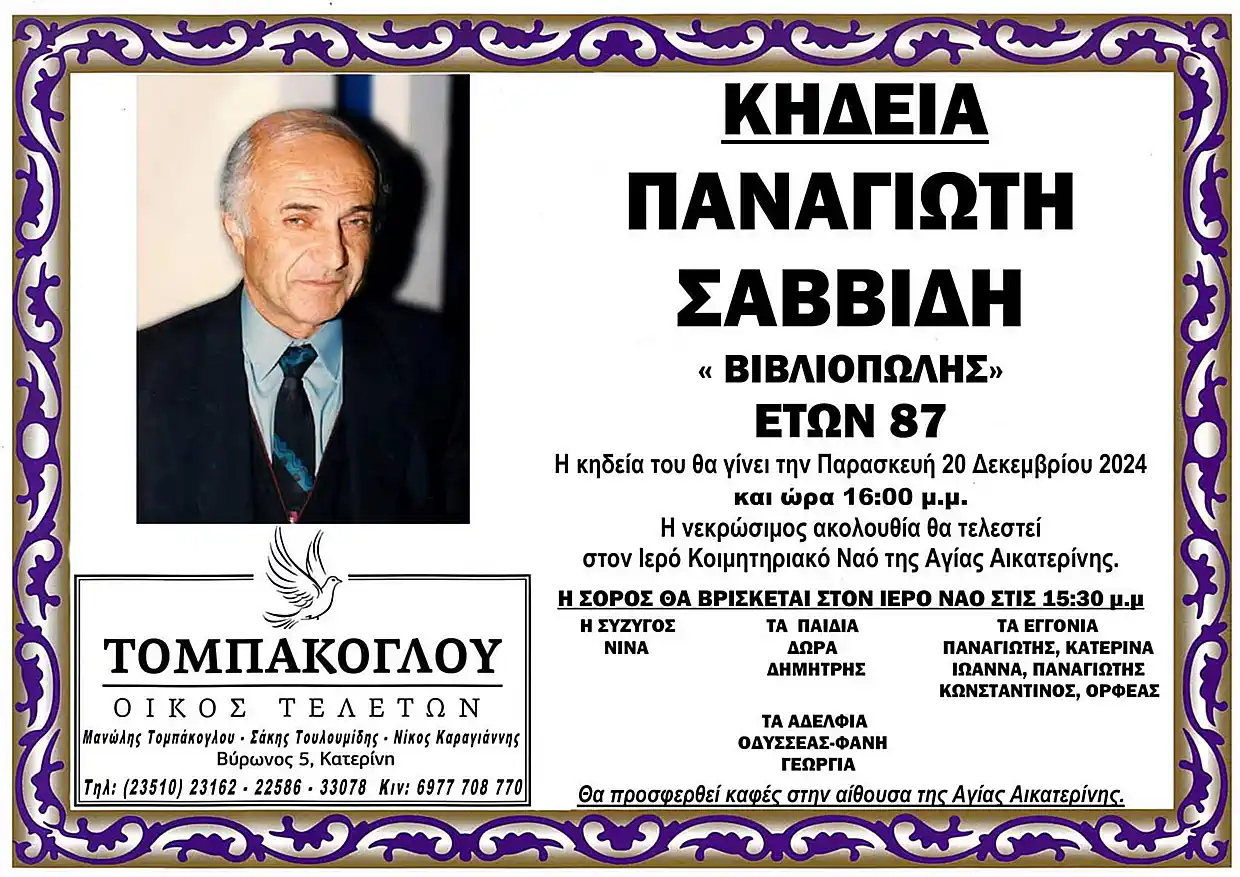Πέθανε σε ηλικία 87 ετών ο Παναγιώτης Σαββίδης, εκ των ιδρυτών του ομώνυμου βιβλιοπωλείου στην Κατερίνη.