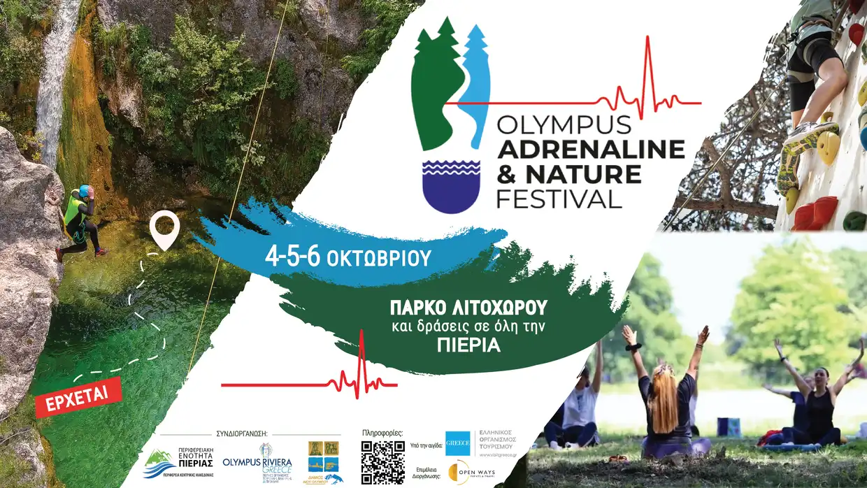 Η Περιφερειακή Ενότητα Πιερίας και ο Πιερικός Οργανισμός Τουριστικής Ανάπτυξης & Προβολής (Π.Ο.Τ.Α.Π.), διοργανώνουν για δεύτερη συνεχόμενη χρονιά το Olympus Adrenaline & Nature Festival, μία πολυθεματική γιορτή φύσης, πολιτισμού και βιωματικών εμπειριών, που εξελίσσεται σε θεσμό και στοχεύει να αναδείξει τη μοναδικότητα της Πιερίας.