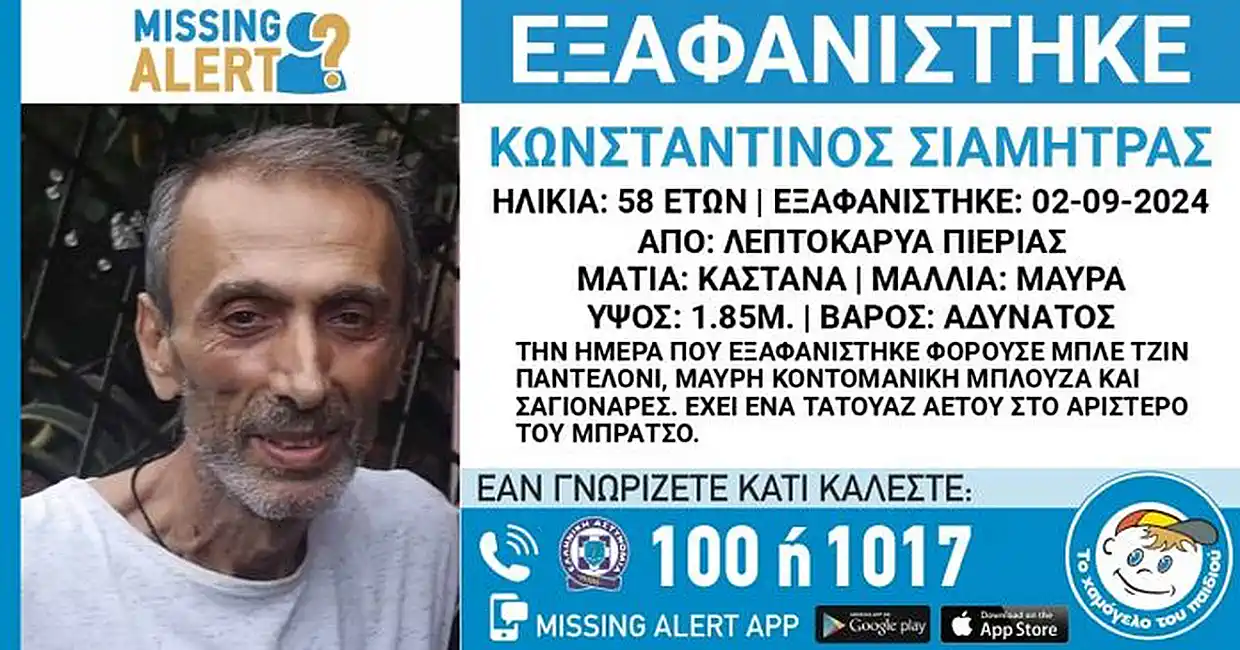 Η ανακοίνωση του «Χαμόγελου του Παιδιού» για την εξαφάνιση του άνδρα αναφέρει ότι στις 2 Σεπτεμβρίου, μεσημεριανές ώρες, στην περιοχή της Λεπτοκαρυάς Πιερίας χάθηκαν τα ίχνη του Κωνσταντίνου Σιαμήτρα, 58 ετών.