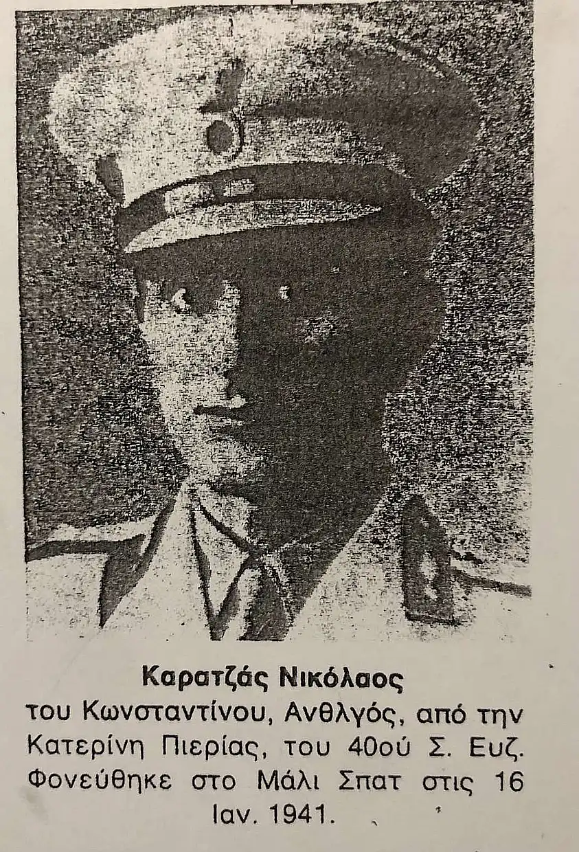- Καραντζάς Νικόλαος του Κωνσταντίνου, Ανθυπολοχαγός: Γεννήθηκε στην Κατερίνη Πιερίας το 1918, του 40ου Συντάγματος Ευζώνων. Φονεύθηκε στο Μάλι Σπατ (Ν. Τεπελενίου) στις 16 Ιανουαρίου 1941.