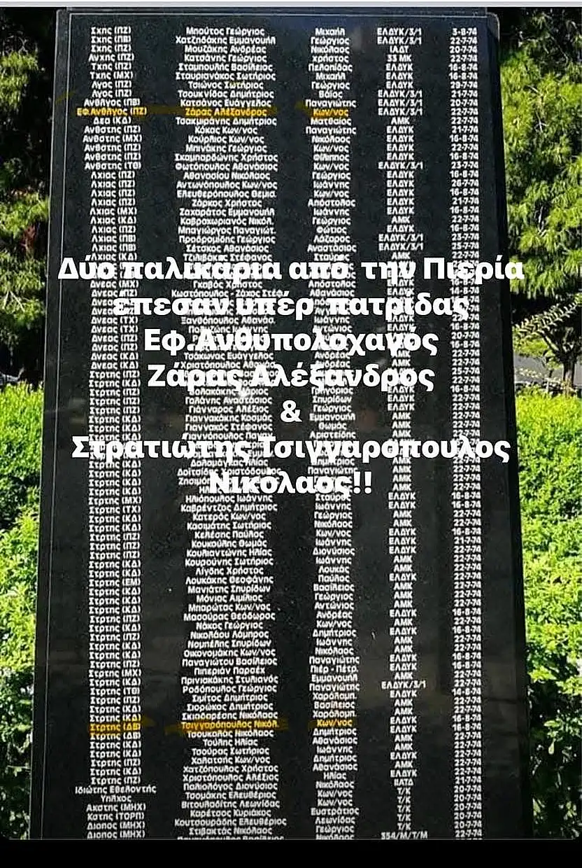 Στα γεγονότα της Κύπρου (έτος 1974) η Πιερία θυσίασε αλλά δύο τέκνα της.