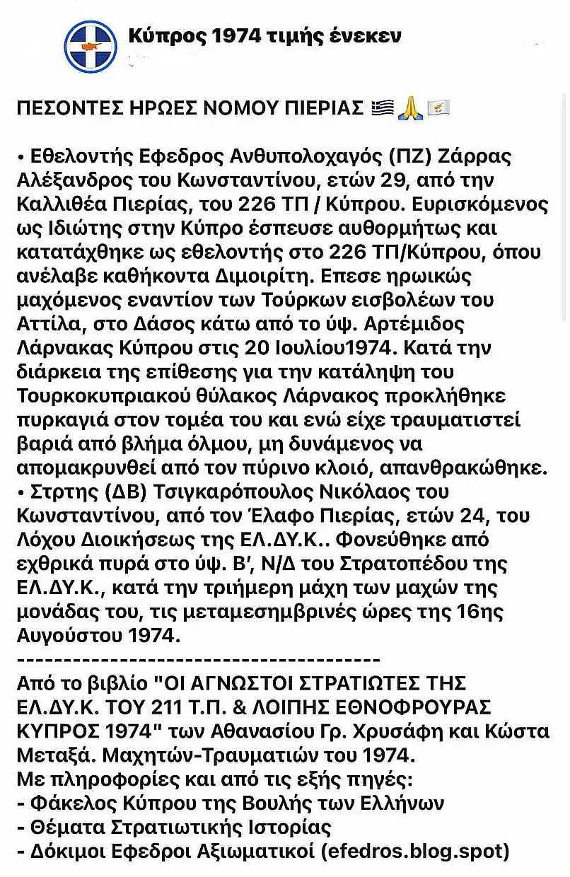 Το κείμενο αυτό αποτελεί τον ελάχιστο φόρο τιμής στα ηρωικά παιδιά της Πιερίας, τόσο στα πολεμικά γεγονότα του «ΟΧΙ» όσο και στα αντίστοιχα της Κύπρου. Μακάρι να ευαισθητοποιήσει τους κρατούντες.
