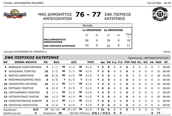 2) Στις 12/12/1982 νίκησε εκτός έδρας τον Δημόκριτο με 76-77.