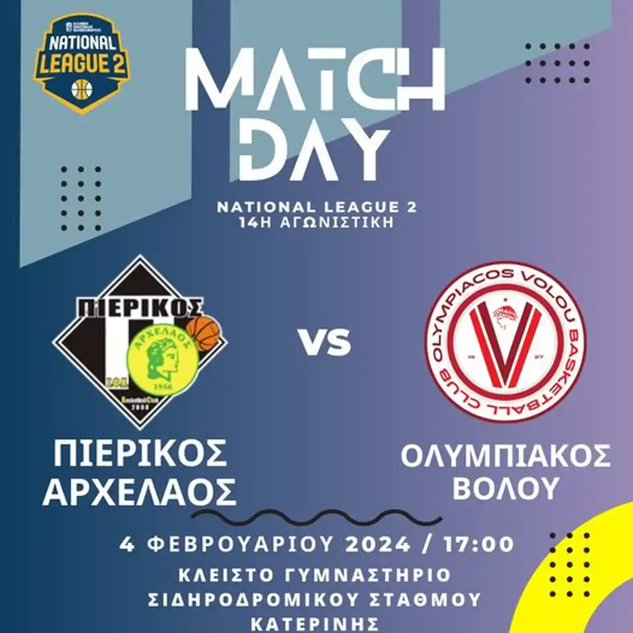 Τον Ολυμπιακό Βόλου (3-10) υποδέχεται ο Πιερικός Αρχέλαος (6-7) την Κυριακή 4 Φεβρουαρίου στις 17:00, στο Κλειστό Γυμναστήριο Σιδηροδρομικού Σταθμού Κατερίνης, στο πλαίσιο της 14ης αγωνιστικής του 4ου ομίλου της National League 2.