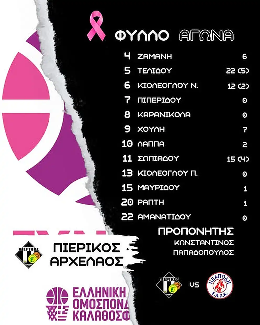 Στα τελευταία λεπτά του αγώνα ο Κωνσταντίνος Παπαδόπουλος έδωσε χρόνο συμμετοχής και στις νεαρές αθλήτριες της ομάδας, με το ροζ φύλλο αγώνα να καταλήγει στον Πιερικό Αρχέλαο με τελικό σκορ 66-46.