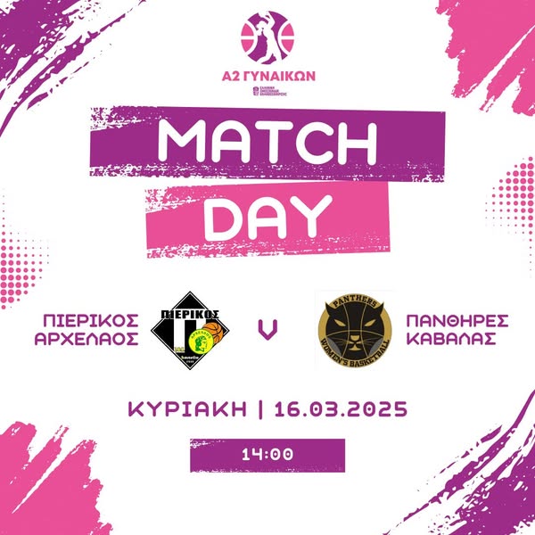 Τους Πάνθηρες Καβάλας (17-2) υποδέχεται ο Πιερικός Αρχέλαος (12-7) την Κυριακή 16 Μαρτίου στις 14:00, στο Κλειστό Γυμναστήριο Σιδηροδρομικού Σταθμού Κατερίνης, στο πλαίσιο της 22ης και τελευταίας αγωνιστικής του 2ου ομίλου της Α2 Εθνικής Κατηγορίας Γυναικών.