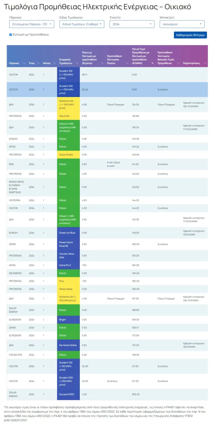 Με αυτά τα δεδομένα, σύμφωνα με το ΑΠΕ, τα δέκα φθηνότερα τιμολόγια για τον Ιανουάριο περιλαμβάνουν πράσινα και κίτρινα. Κατά σειρά είναι τα εξής: