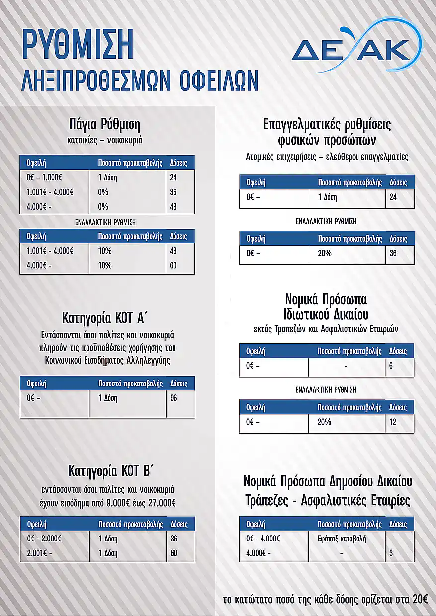 Για τους καταναλωτές που πληρούν τις προϋποθέσεις χορήγησης του Κοινωνικού Εισοδήματος Αλληλεγγύης (Κατηγορία ΚΟΤ Α’) προβλέπονται έως 96 δόσεις. Στους καταναλωτές που εντάσσονται στο τιμολόγιο ΚΟΤ Β’ προβλέπονται από 36 έως 60 δόσεις ανάλογα με το ποσό της οφειλής προς την επιχείρηση. Και εδώ το ποσό της μηνιαίας δόσης δεν μπορεί να είναι μικρότερο των 20€.