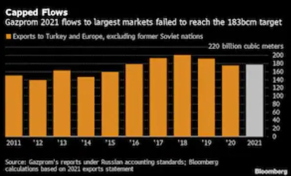 Οι αποστολές της Gazprom προς την Ευρώπη και την Τουρκία ήταν περίπου 177 δισεκατομμύρια κυβικά μέτρα το 2021, σύμφωνα με υπολογισμούς του Bloomberg News και της BCS Global Markets με βάση τα στοιχεία της εταιρείας.