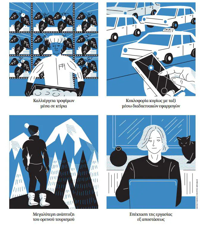 Η κυκλοφορία θα περιοριστεί, αφού οι περισσότεροι πολίτες θα εργάζονται από τα σπίτια τους για εταιρείες που βρίσκονται στην Ελλάδα, στην Ευρώπη ή σε άλλα μέρη του κόσμου. Τα ιδιόκτητα αυτοκίνητα θα είναι λιγότερα, θα προτιμώνται τα ταξί μέσω διαδικτυακών εφαρμογών.