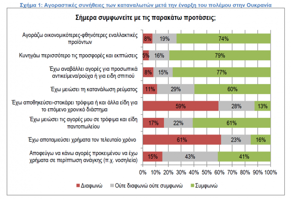 Όπως καταγράφεται στο σχήμα 1, υπάρχουν σημαντικές αλλαγές στις καταναλωτικές συνήθειες των καταναλωτών σε διάφορες περιοχές συμπεριφορών, οι οποίες αποδίδονται είτε στον πόλεμο στην Ουκρανία, είτε στις συνέπειες του πολέμου (π.χ. ανατιμήσεις προϊόντων).
